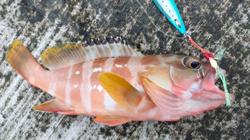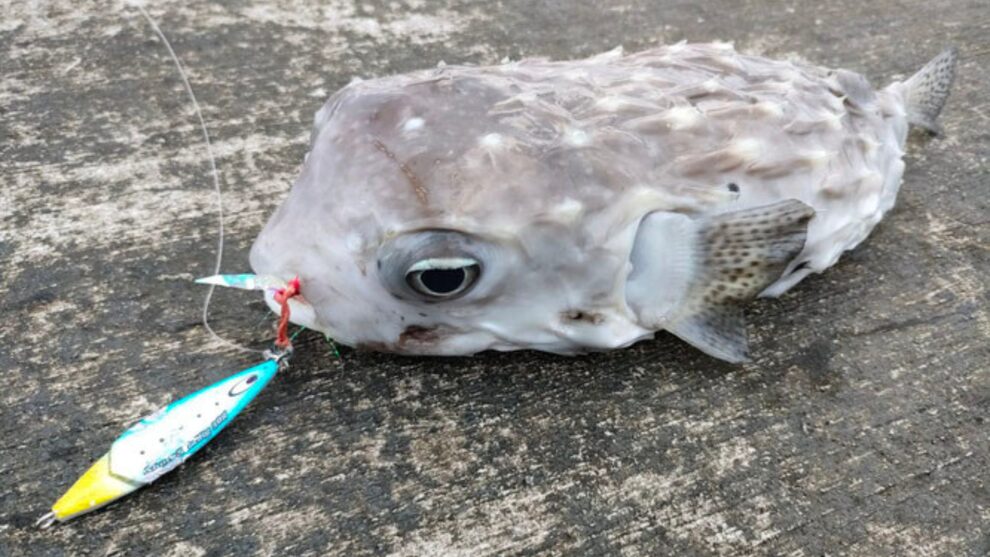 そして久しぶりに釣れた魚はイシガキフグ。ルアーで釣れたのは初めてです。よく見るとかわいい顔をしています。久しぶりに魚が釣れたと思っていた矢先に根掛かりしてラインブレイクで終了となりました。